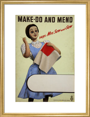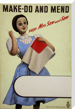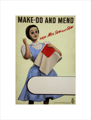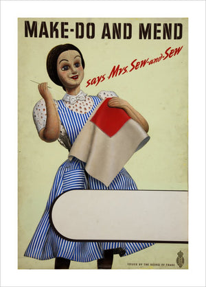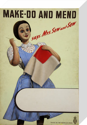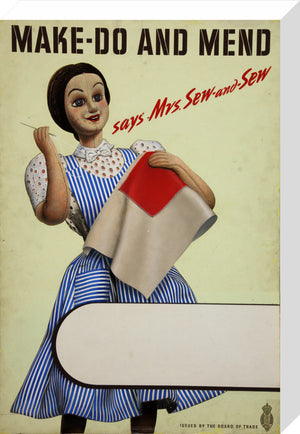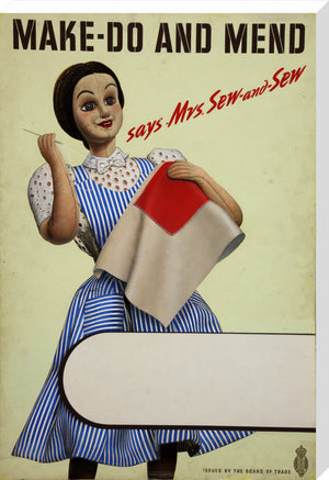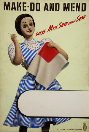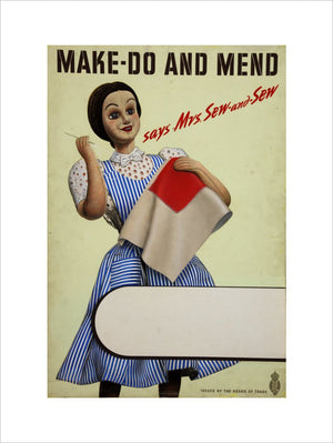 Second World War public information poster in the Make do and Mend campaign, featuring the character of Mrs Sew and Sew. This poster was issued by the Ministry of Information on behalf of the Board of Trade.