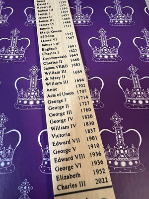 A true classic which has been updated to include the start of the reign of Charles III. A fun royal history aide memoire this wooden ruler has measurements in both centimetres and inches on one side and has a timeline featuring the reigns to Charles III on the other. Produced with incised printing.
