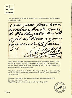 This unique and beautiful greetings card is one of a series made exclusively for The National Archives by Passenger Press. The cards feature images from gorgeous playing cards from the eighteenth century which were found among papers of the French merchant ship L'Aimable Julie and were presumably used by sailors aboard ship to entertain themselves. They are approximately 6x4 inches in size.