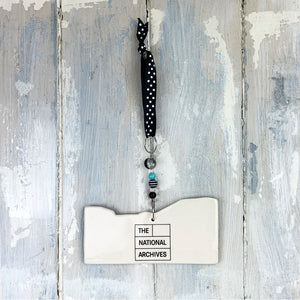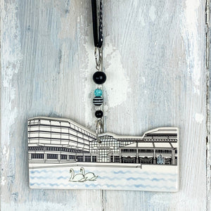 The National Archives’ distinctive brutalist building, with it’s imposing stacked concrete slabs, was purpose-built in 1976 and in later years linked to a post-modern extension. Ceramic decoration handmade in Berkshire by Roelofs & Rubens using traditional techniques.