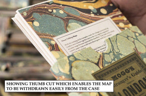 Reproduction map laid on cloth. Pigment ink, archival paper, hand-laid on cloth, & folded into a marbled slip case as the original antique folding maps. (marbled slip case colour and pattern will vary). Individually made by hand in Devon.